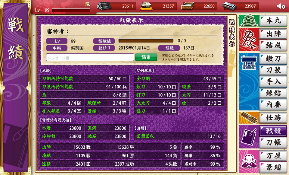 山伏92/同田貫86/獅子王79/江雪4/鶴丸8/蛍丸2/鶯丸5/一期一振2